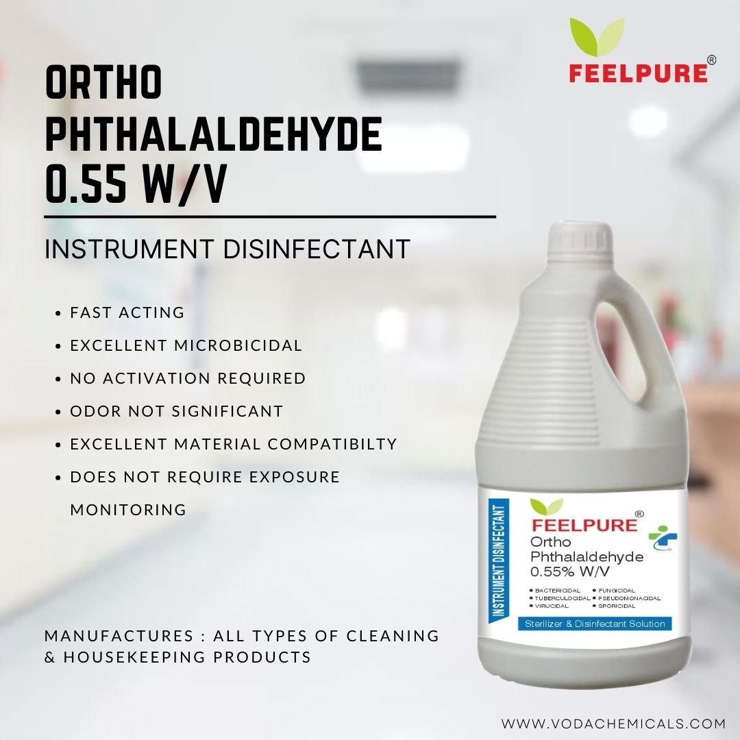 Voda Feelpure Ortho Phthalaldehyde 0.55% is a powerful, ready-to-use high-level disinfectant designed specifically for heat-sensitive medical and surgical instruments. Formulated with 0.55% OPA (Ortho Phthalaldehyde), it provides fast and effective disinfection without compromising the material integrity of delicate equipment. Manufactured by Voda Chemicals Pvt. Ltd., this advanced solution is ideal for endoscopes, cystoscopes, and other reusable medical devices, ensuring both safety and compliance with infection control protocols.