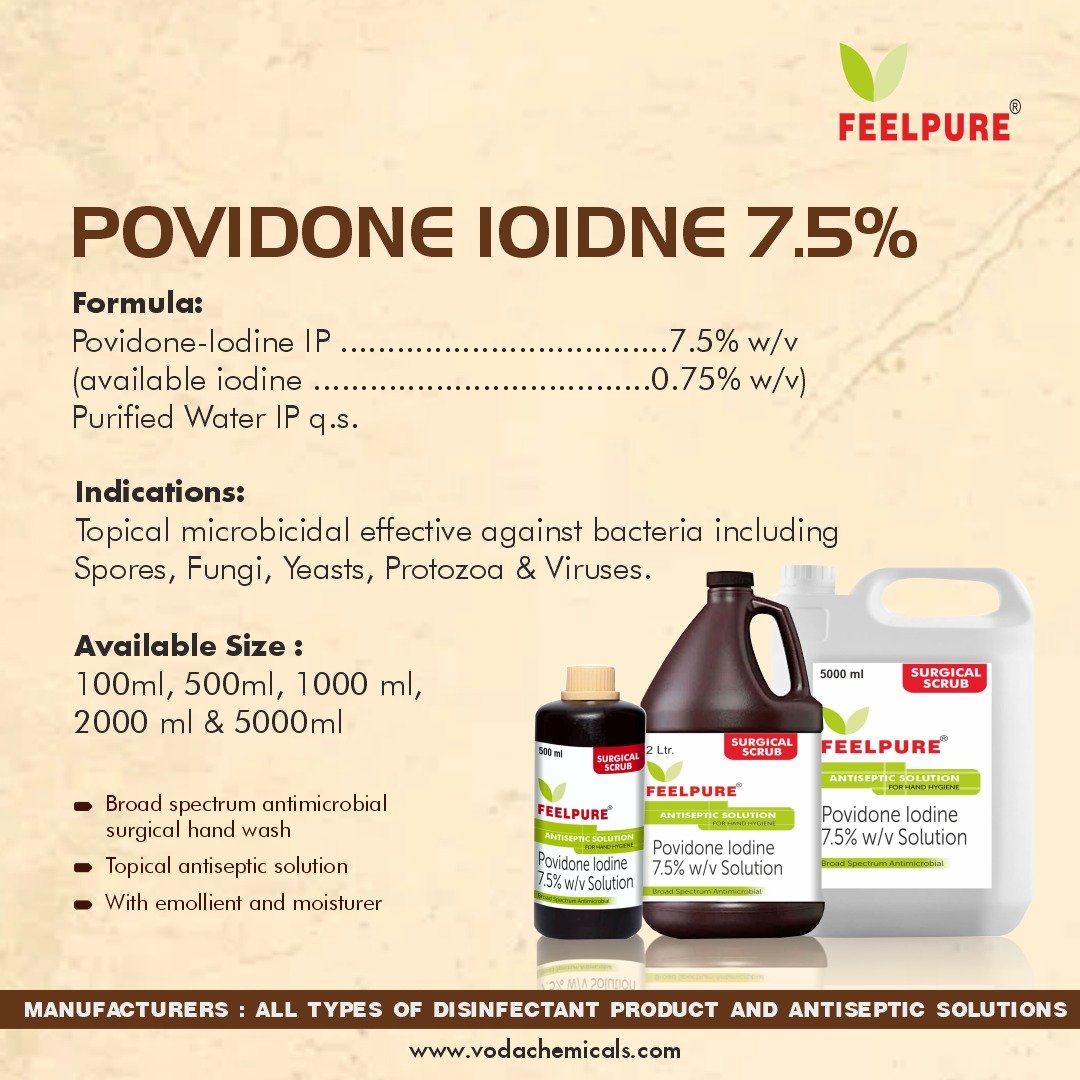 Voda Feelpure Surgical Scrub Povidone Iodine 7.5% is a powerful antiseptic solution for pre-surgical hand scrub, skin disinfection, and wound care. Kills 99.9% of germs and ensures hospital-grade hygiene. Order now for medical & healthcare use! 🏥